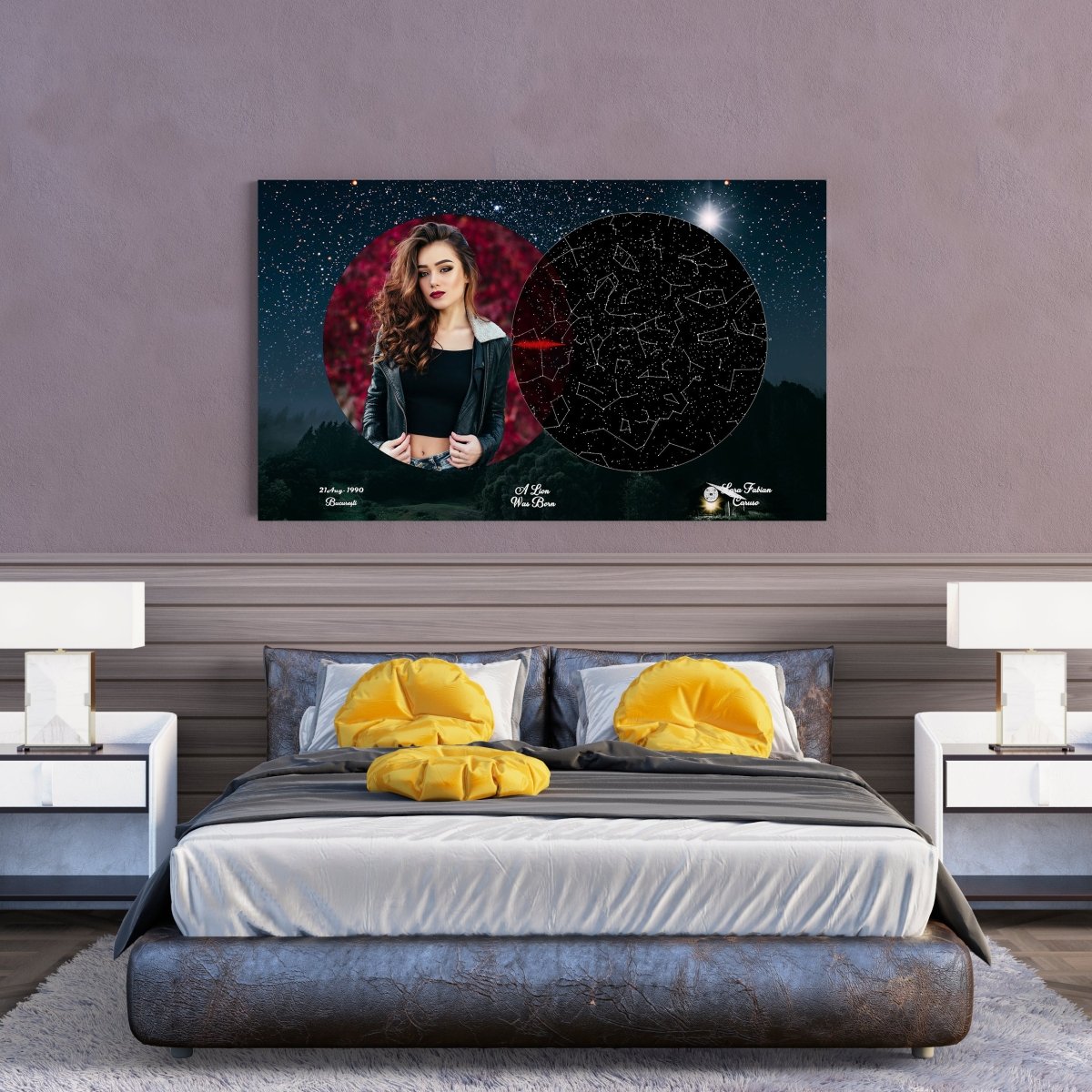 ▶ ︎ Puteți personaliza textul / citatul, data și locația exactă. Poate fi un oraș sau o locație exactă în oraș și vom trasa cerul nopții și vom lista coordonatele efective.